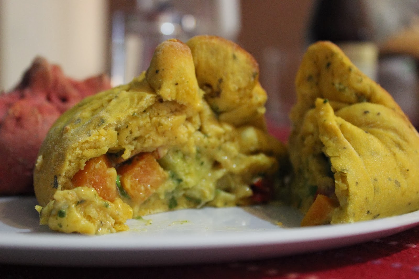 Super simple- roast/ steam/ boil root veggies until really soft, mash, stir in steamed greens (broccoli, brussel sprouts, beans, peas, broad beans etc), optional- stir in a chopped up veggie burger. Place on wrap, wrap it up and toast it in a sandwich press. Too easy + delicious! :)