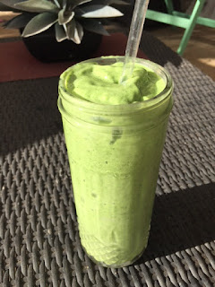 This bad boy featured 1 large frozen banana, 1 large handful frozen zucchini, 4 cubes frozen spinach, small handful frozen mango, 3 big spoons greek yoghurt, 3/4 cup rolled oats soaked in 1 cup almond milk for 15 mins, splash of water to get things rolling!