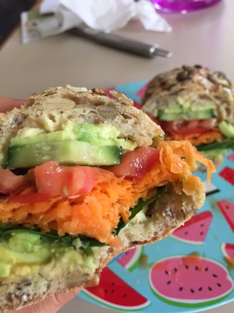Lunch yesterday was a cracker (just like brekky... it was a good day for food!!)A toasted cape seed roll (also from work- wholemeal with9 grains and seeds!) spread with lots of hommus, topped with spinach, grilled eggplant, portobello mushroom, capsicum, zucchini and some fresh tomato slices- toasted off in a sandiwch press for a few mins until golden brown on top- NOM!
