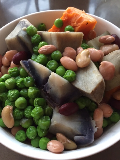 This amazing bowl of incredible yumminess involved some cold steamed purple and white sweet potato and butternut pumpkin with some peas and mixed four beans: