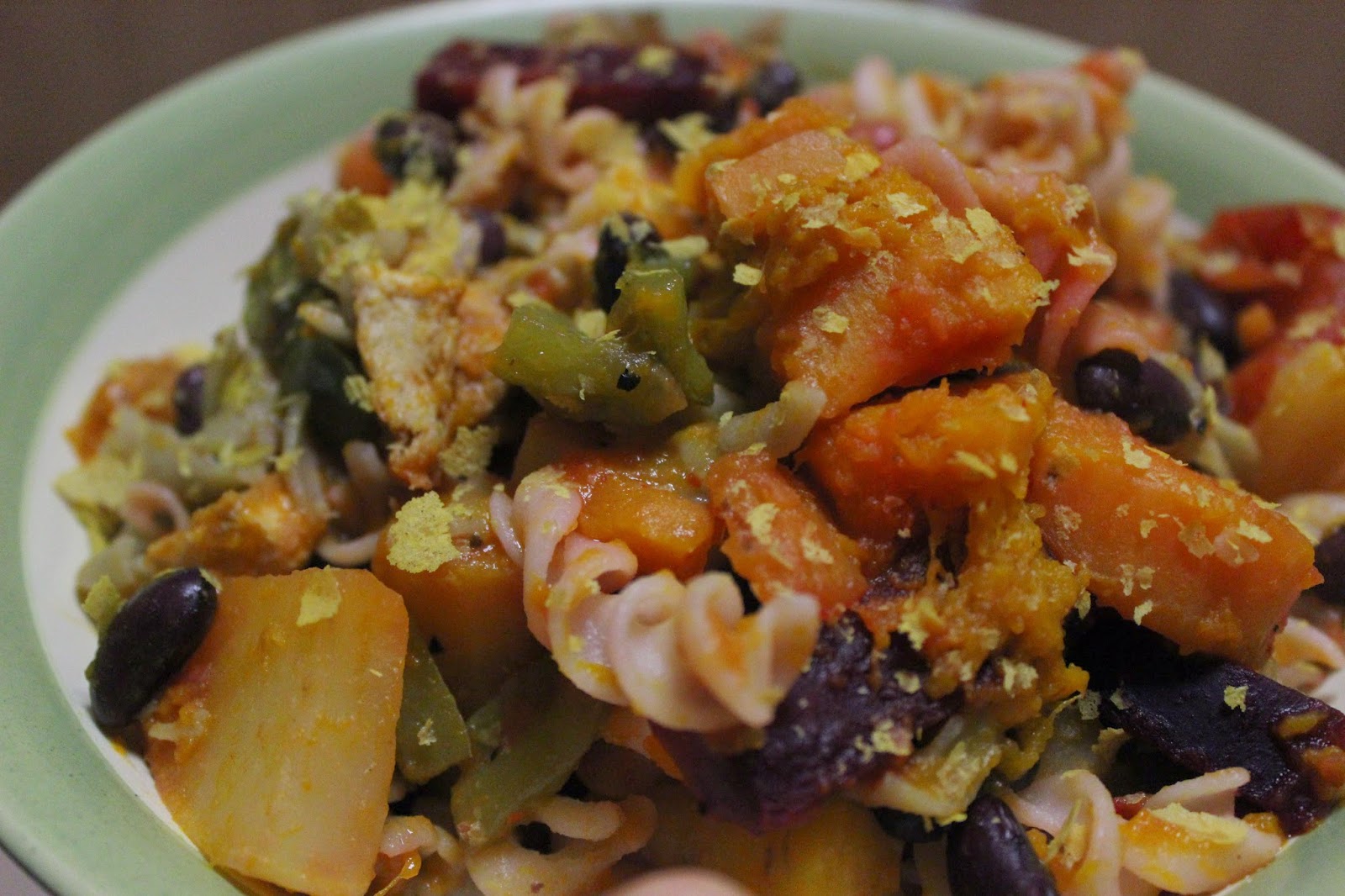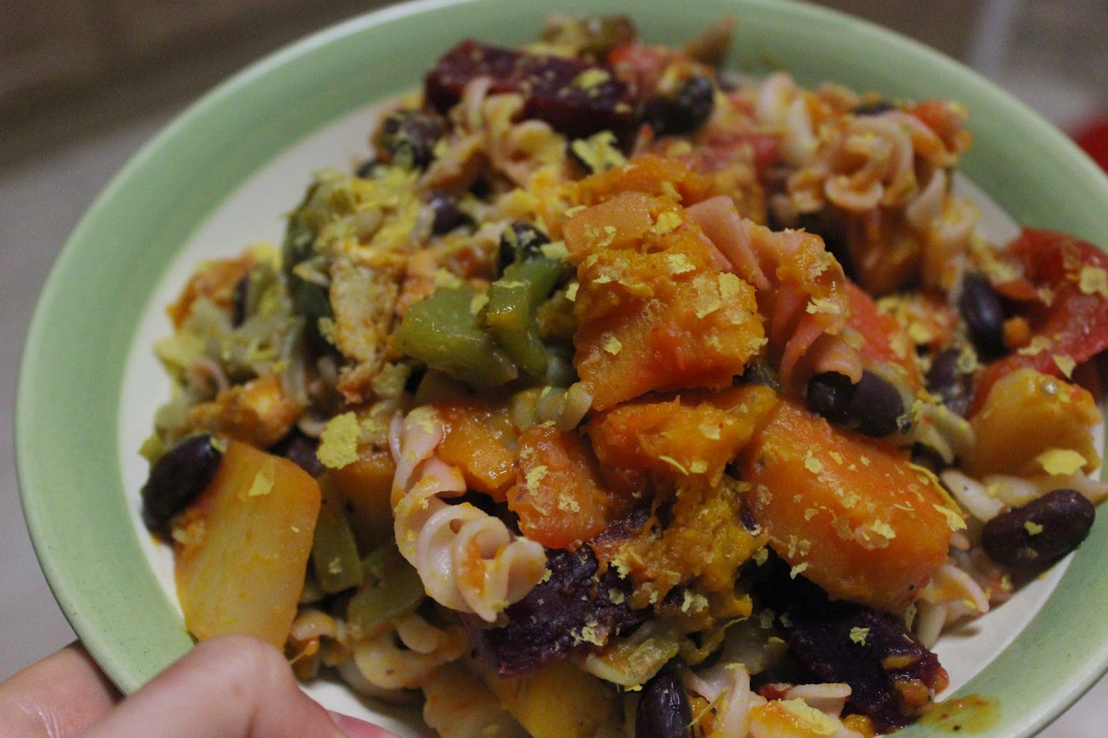 Rice flour pasta, with steamed veggies, (beetroot, swede, pumpkin, sweet potato) red kidney beans, roasted tomatoes and capsicum all stirred together and topped with a sprinkle of nutritional yeast: