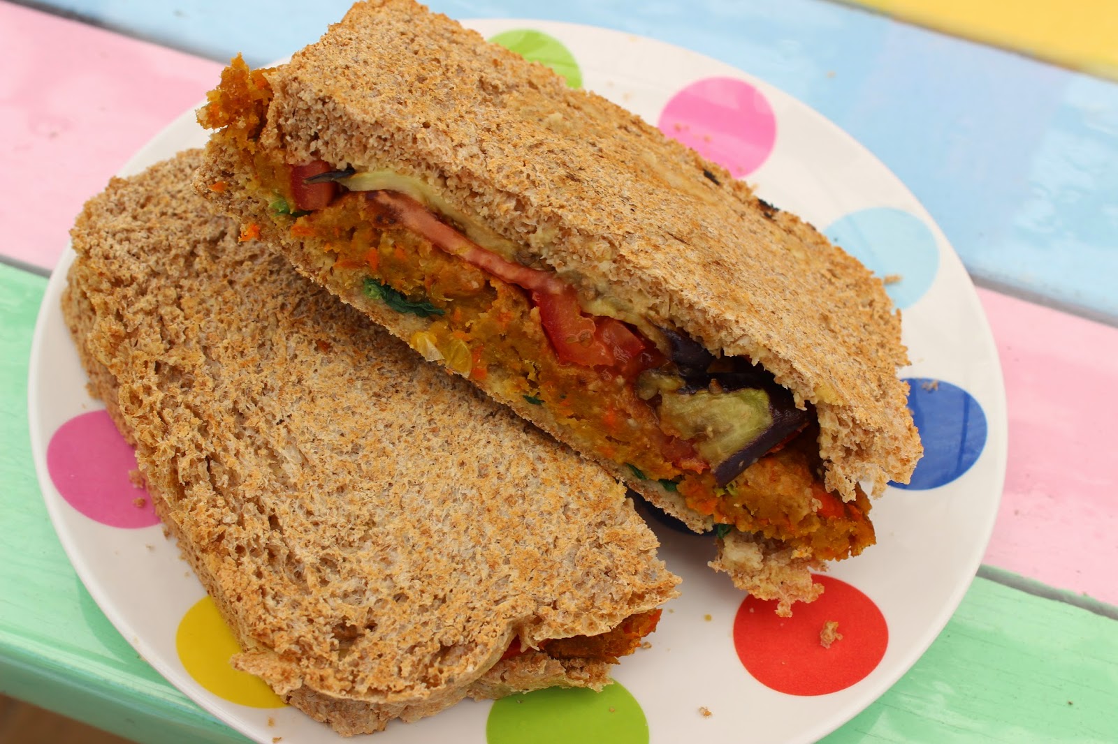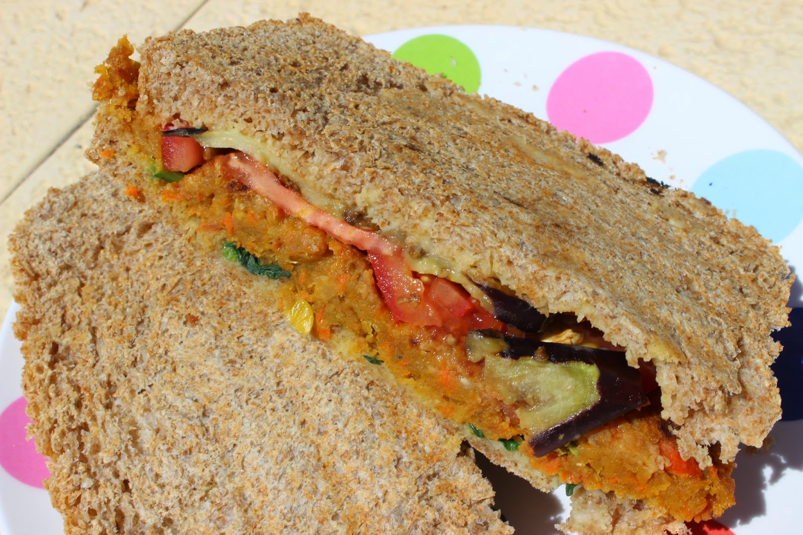 Grilled veggie burger, charred capsicum, mushrooms and eggplant on wholemeal spelt bread, spread with hommus with some spinach and sliced tomato aswell.