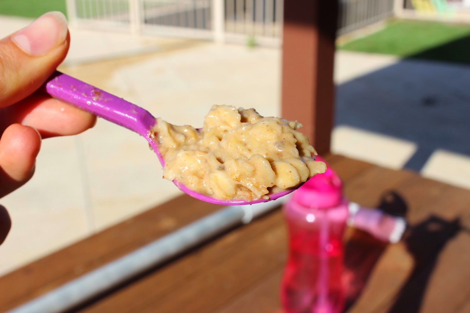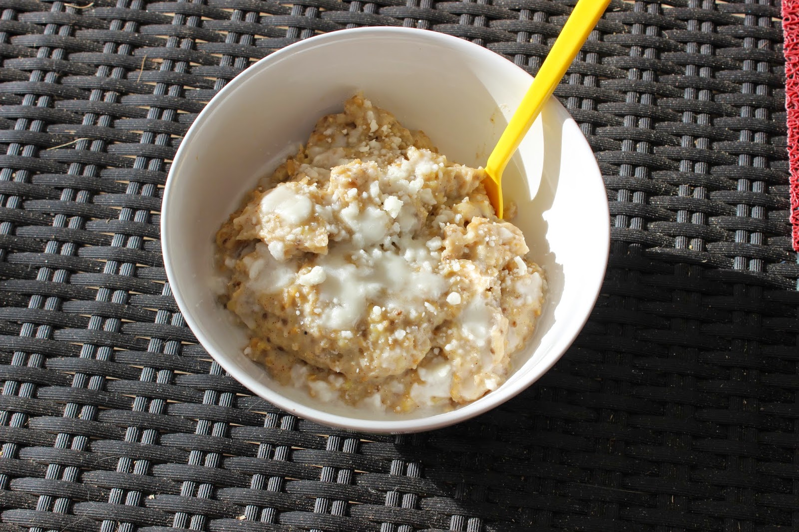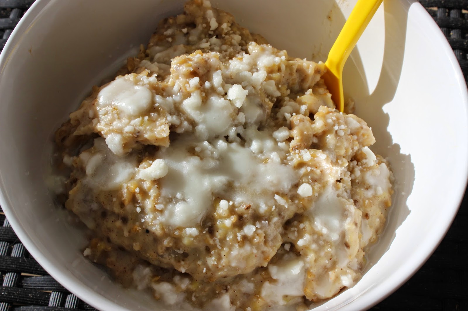 The oats were just 1/3 cup rolled oats with a small banana, a dash of cinnamon, a sprinkle of chia seeds and a scoop of vegan vanilla protein powder along with 1 cup of almond milk, left to bubble away in a saucepan until all the liquid was absorbed: