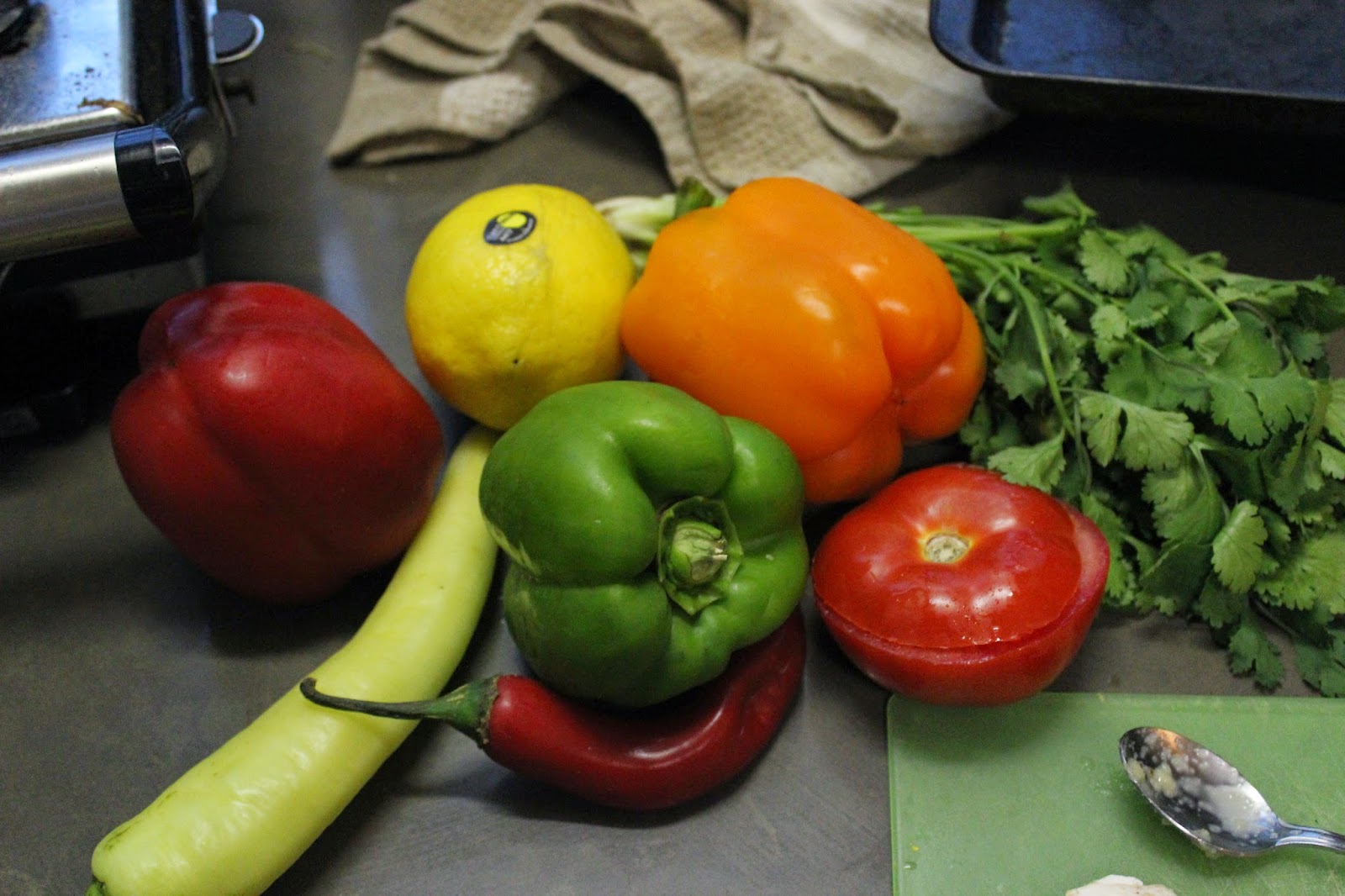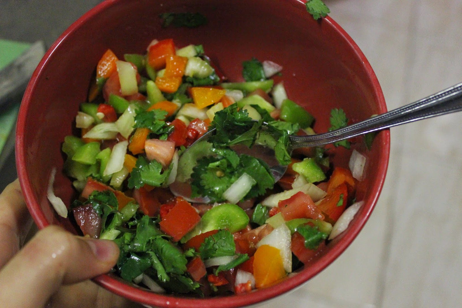 I chopped up a little bit of each coloured capsicum, 1/2 a beautifully ripe tomato, 1/4 red chili and 1/4 of a bigger sweeter chili, a small handful of coriander and then squeezed in some lemon juice: