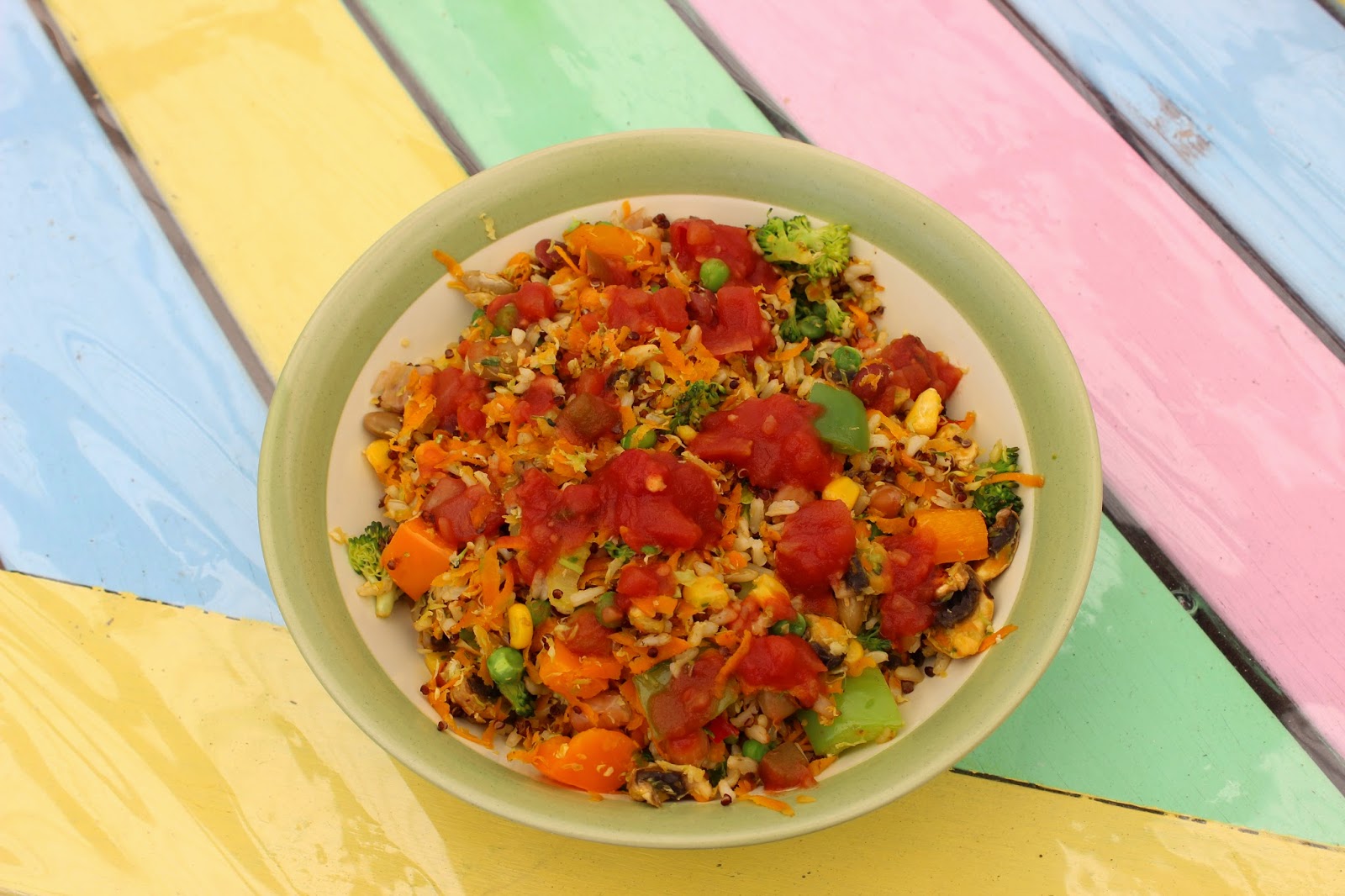 A delicious bowl of stir-fried veggies (grated carrot, grated brussels sprouts, broccoli, corn, peas, capsicum, mixed 4-beans, lentils, mushrooms) chucked in a fry pan with garlic and olive oil, with some pre-cooked rice and quinoa mixed in at the end:
