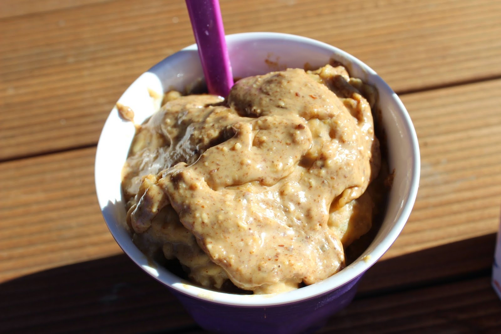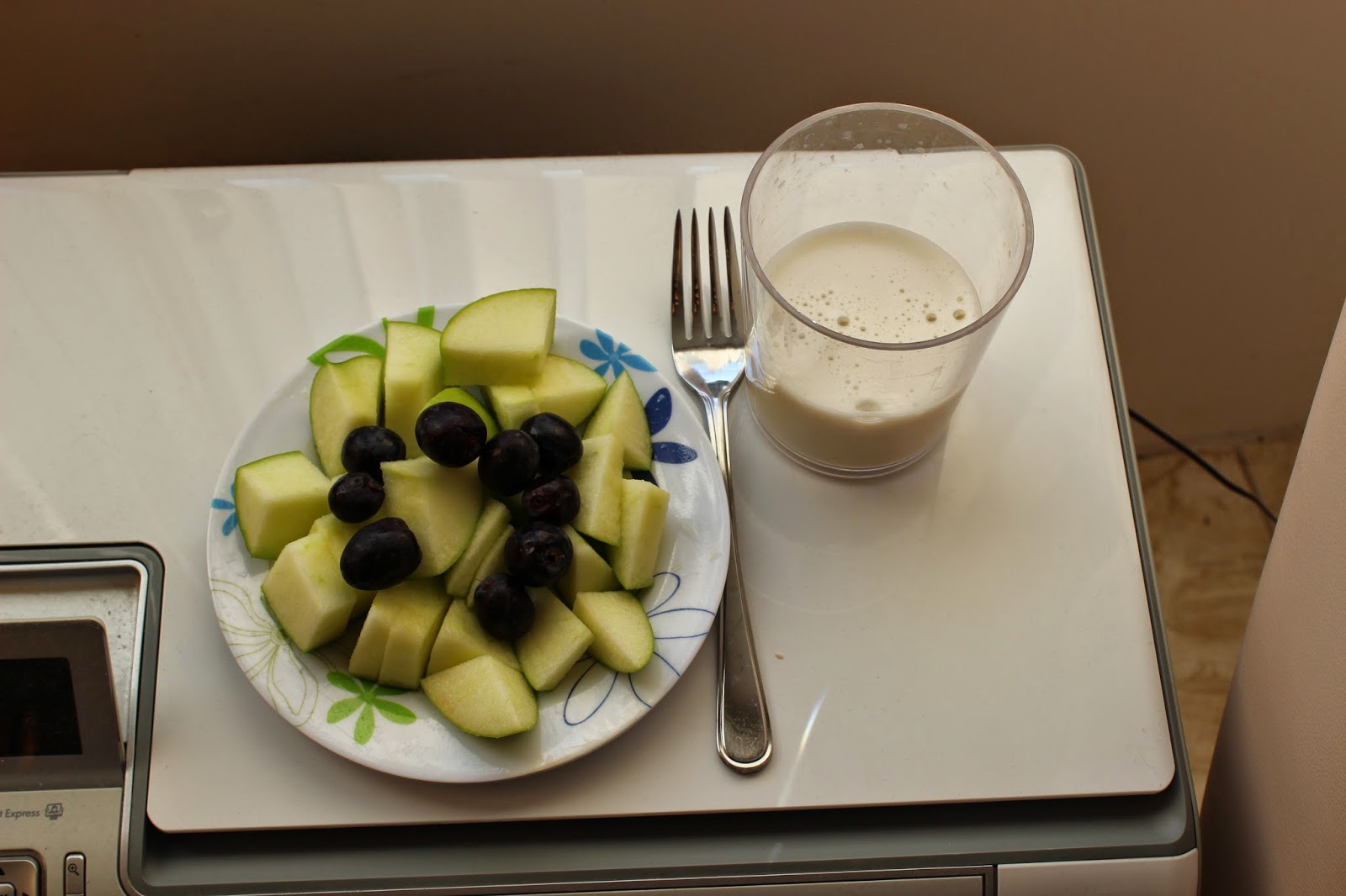 After a lovely lie in (7:00am- that's late for me!) I sprung out of bed and headed straight to the kitchen to make some delicious vanilla protein oats with a side of kiwi/grape fro-yo!