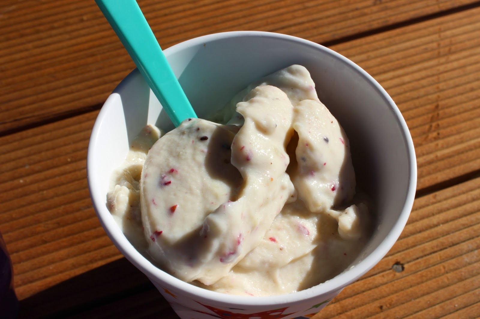 The fro-yo was just 1 chopped frozen kiwi fruit+ a small handful of frozen grapes +3 big spoons of greek yoghurt, whazzed together in a small food processor until smooth: