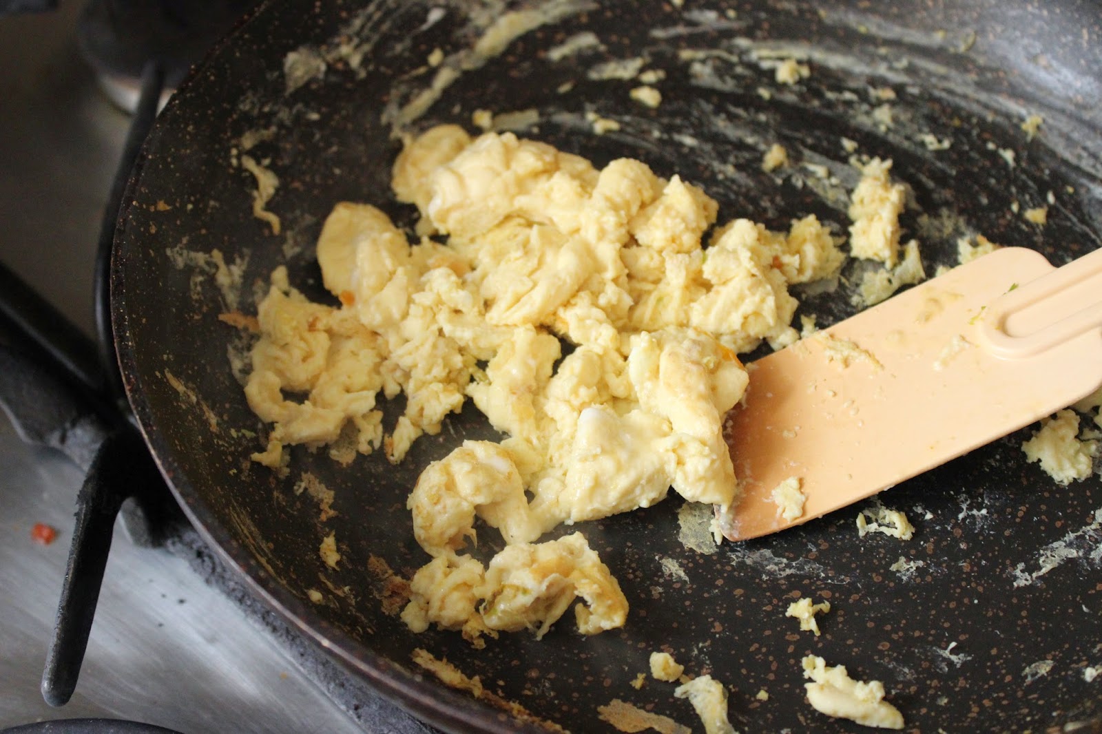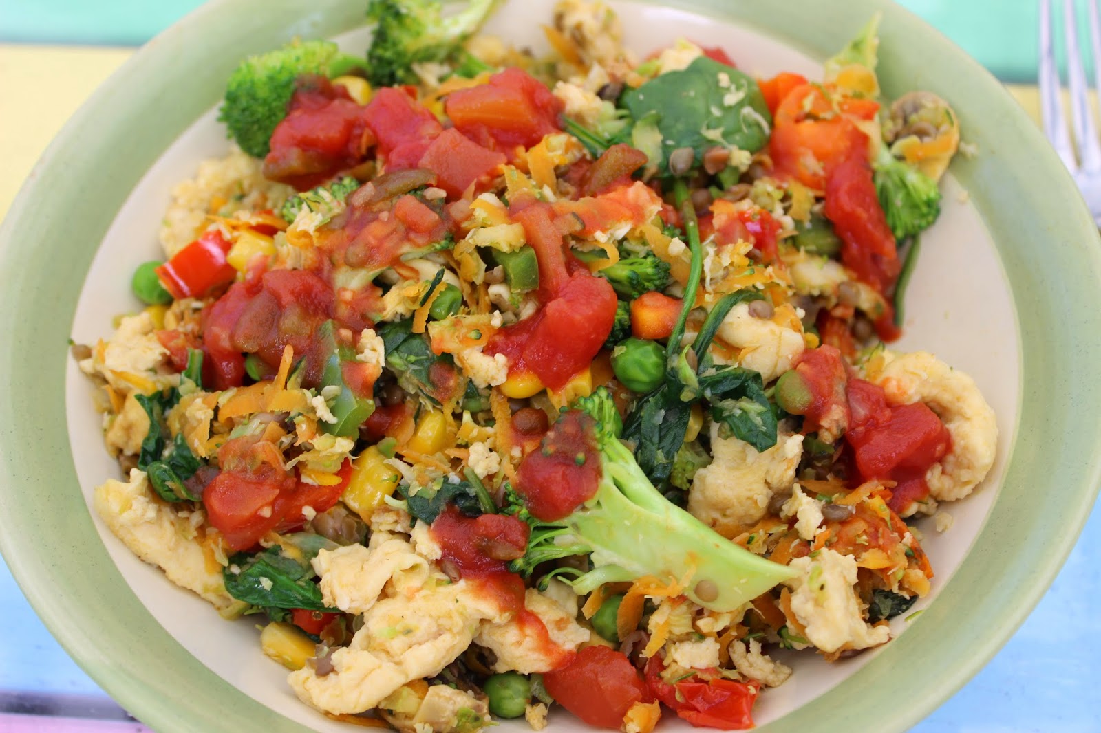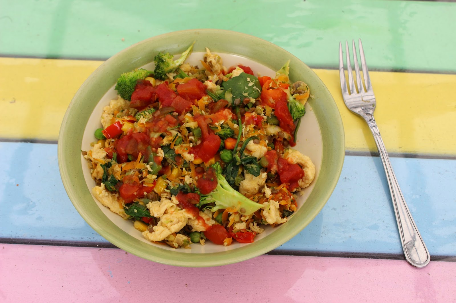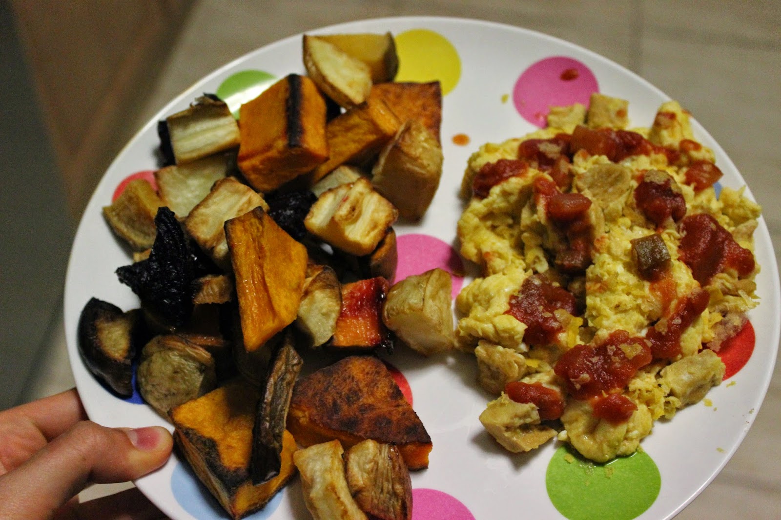 5. I also knew ahead of time that I was going to be late home the other night, so in the morning I roasted up a heap of veggies, let them cool and then placed them in the fridge for that night, where I quickly scrambled up some eggs topped with salsa to go with them: