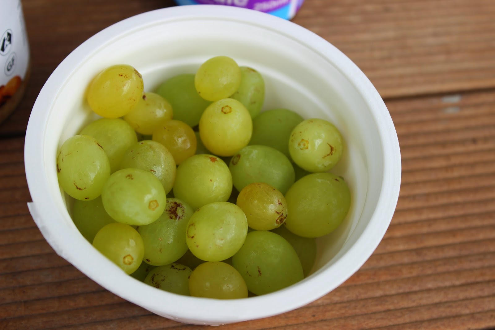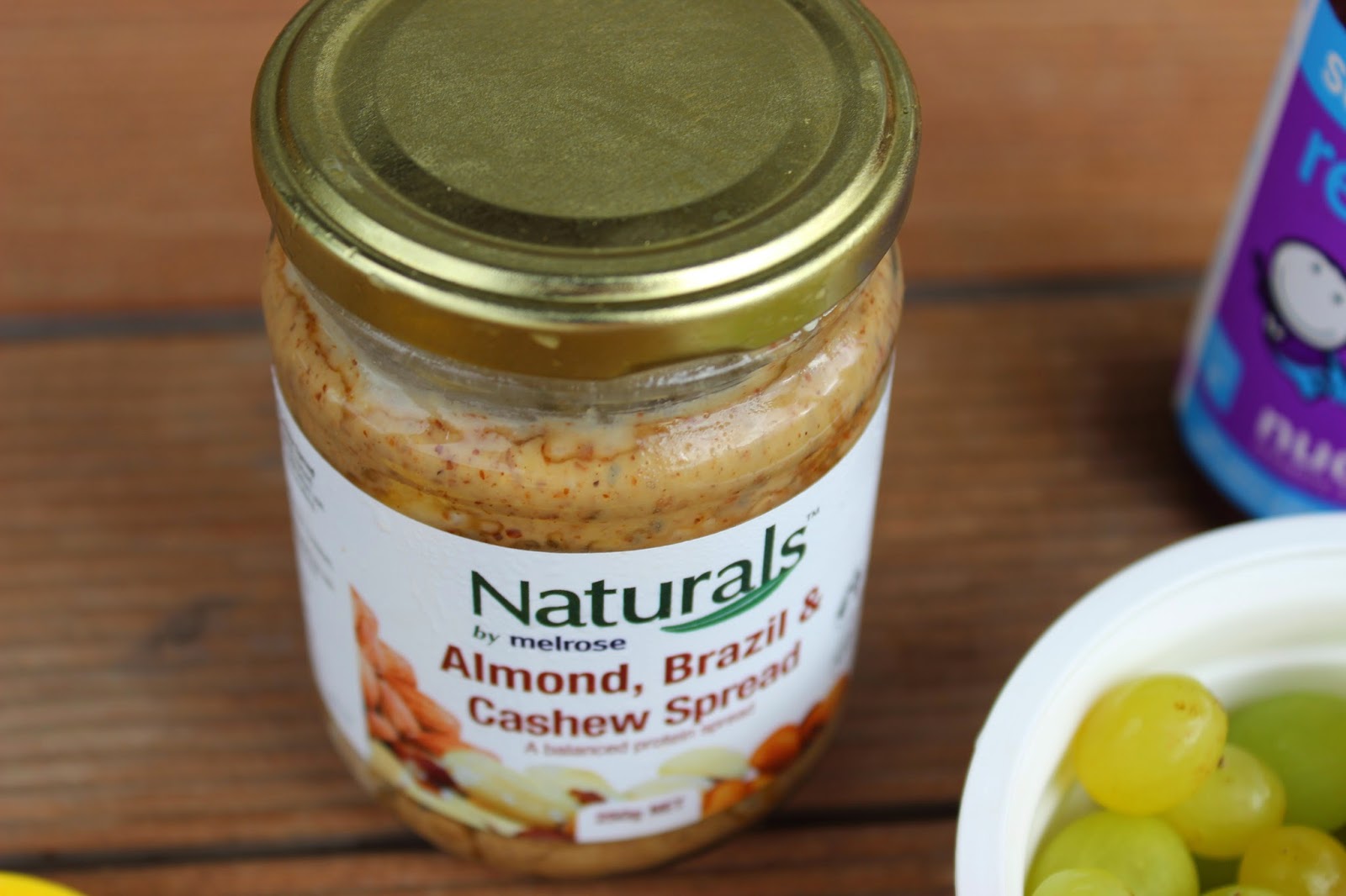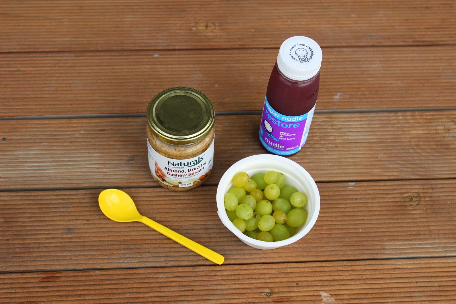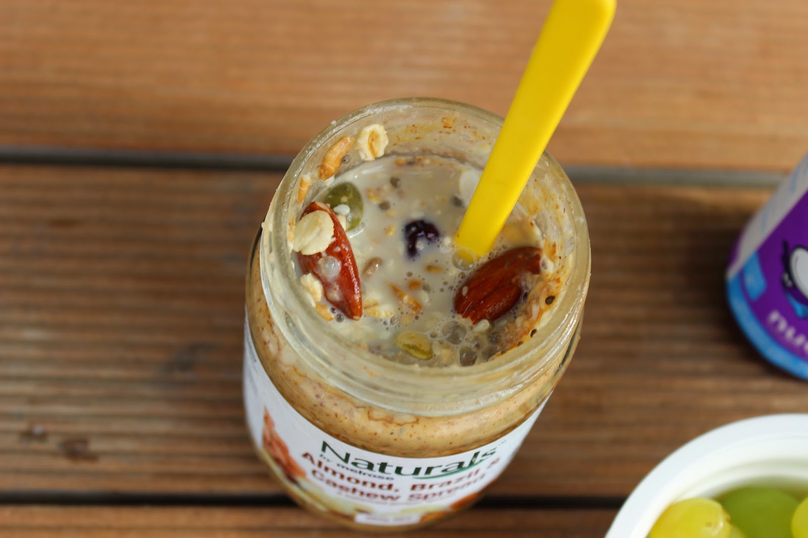 Overnight oats in an almost empty jar of mixed nut butter, green grapes and a nudie juice