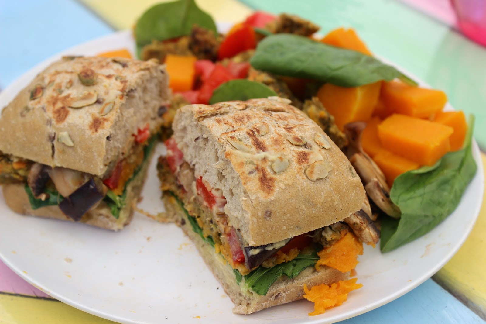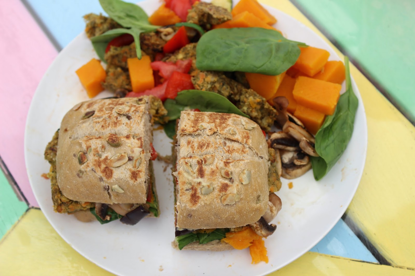 A multi-grain roll with hommus, steamed pumpkin, spinach, veggie burger, grilled capsicum, eggplant, zucchini and sliced tomato: