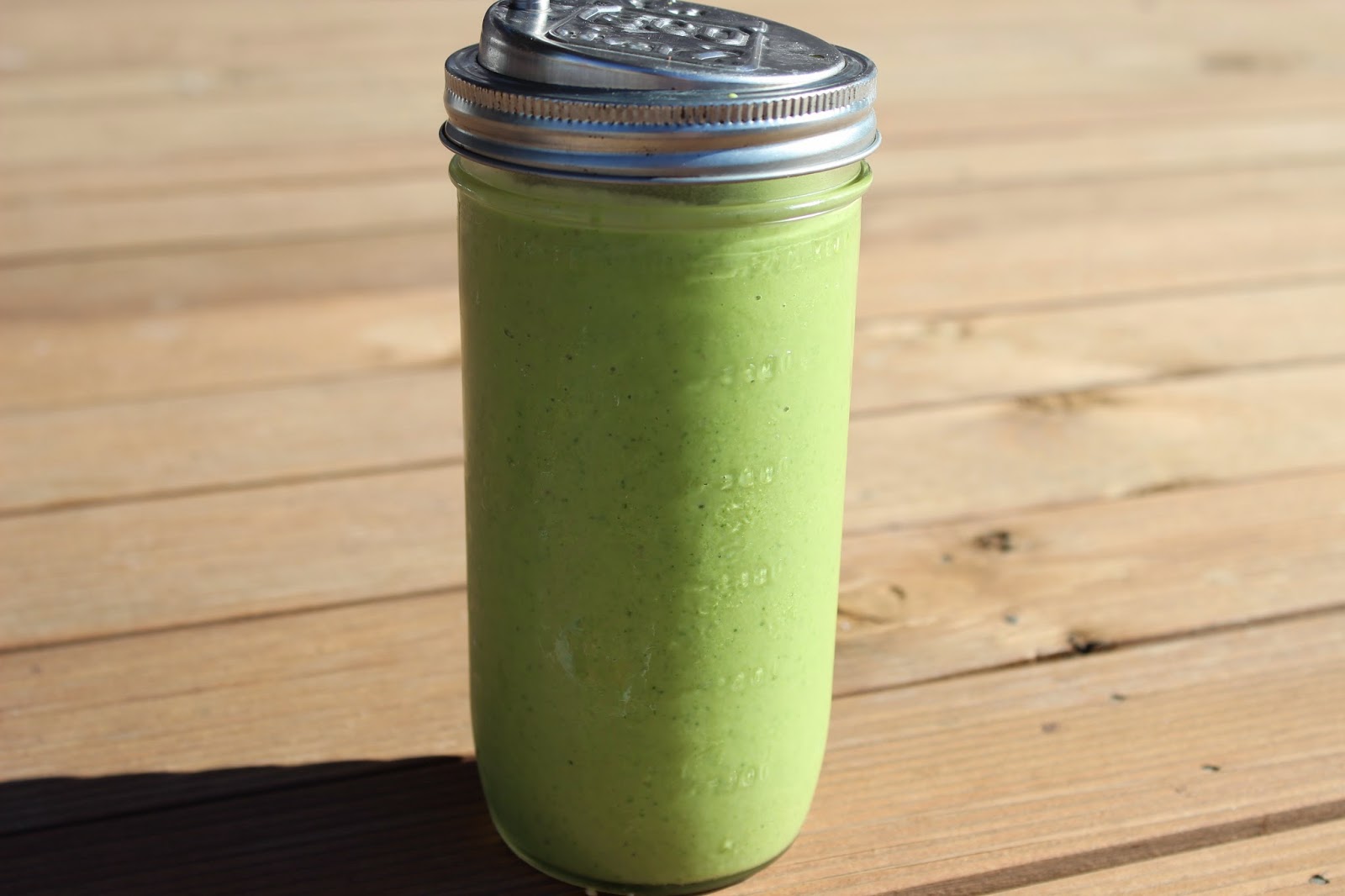 1 chopped frozen banana, 1/2 chopped frozen avocado, 1 big handful of kale, 1 big handful of spinach, 3 scoops of greek yoghurt, a scoop of vanilla protein powder and about 1/3 cup oat milk- all whazzed up together until smoothy smooth.