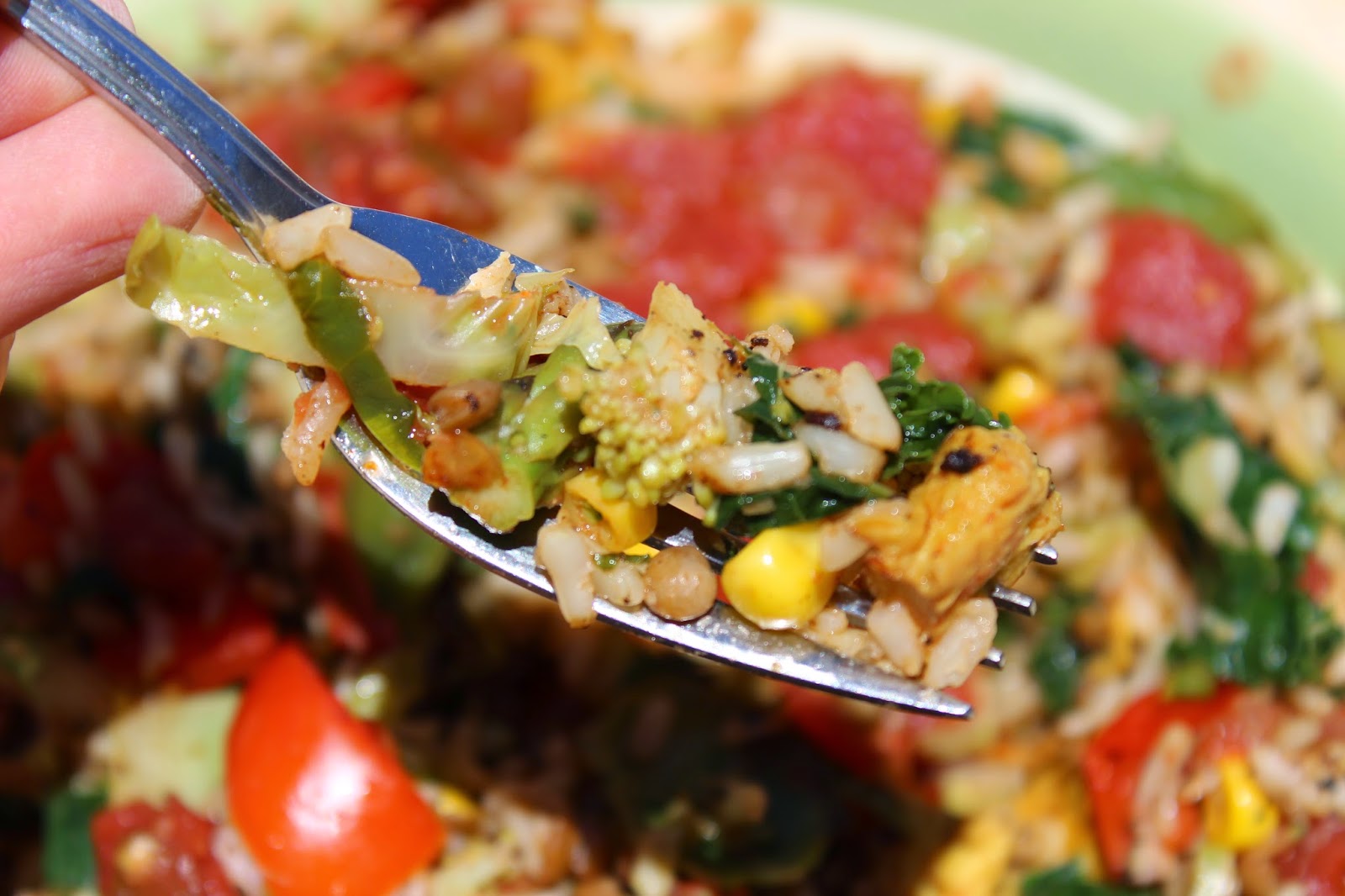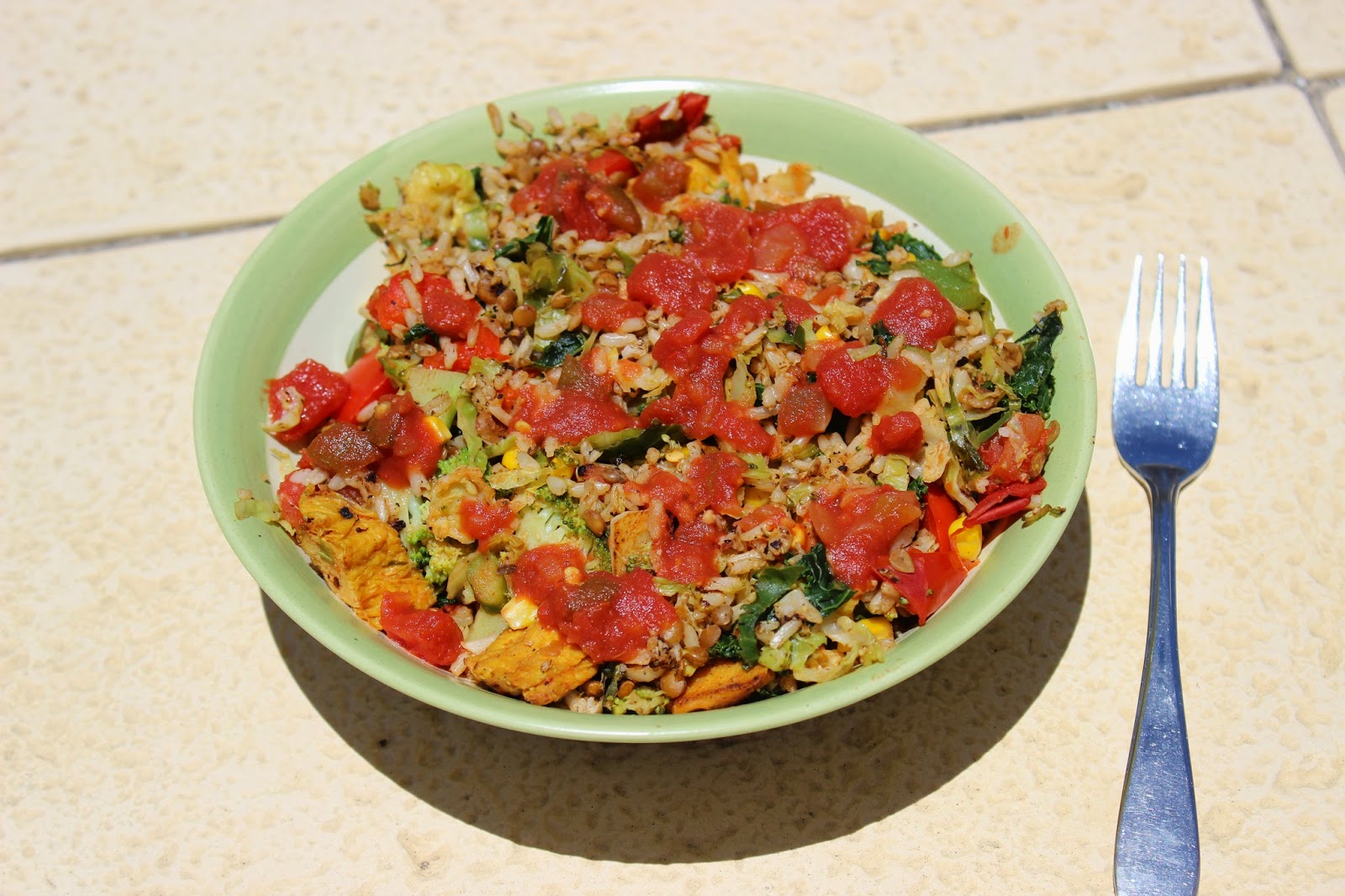 Chopped, broccoli, brussels sprouts, capsicum, tomato, corn, kale, zucchini, lentils and satay tofu all chucked in a fry pan with garlic and some water, cooked for about 5 mins until soft and then mixed with a cup of cooked brown rice: