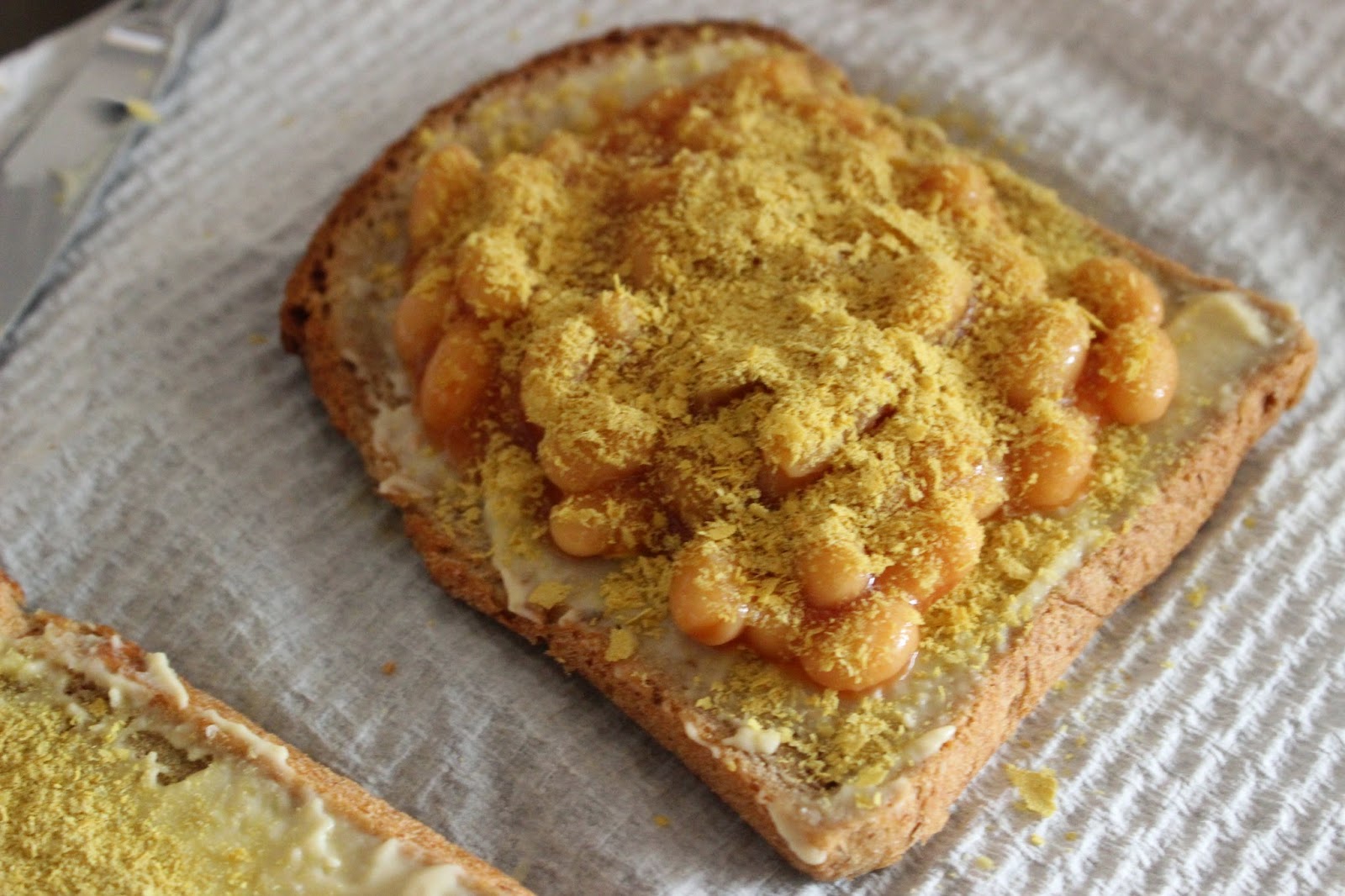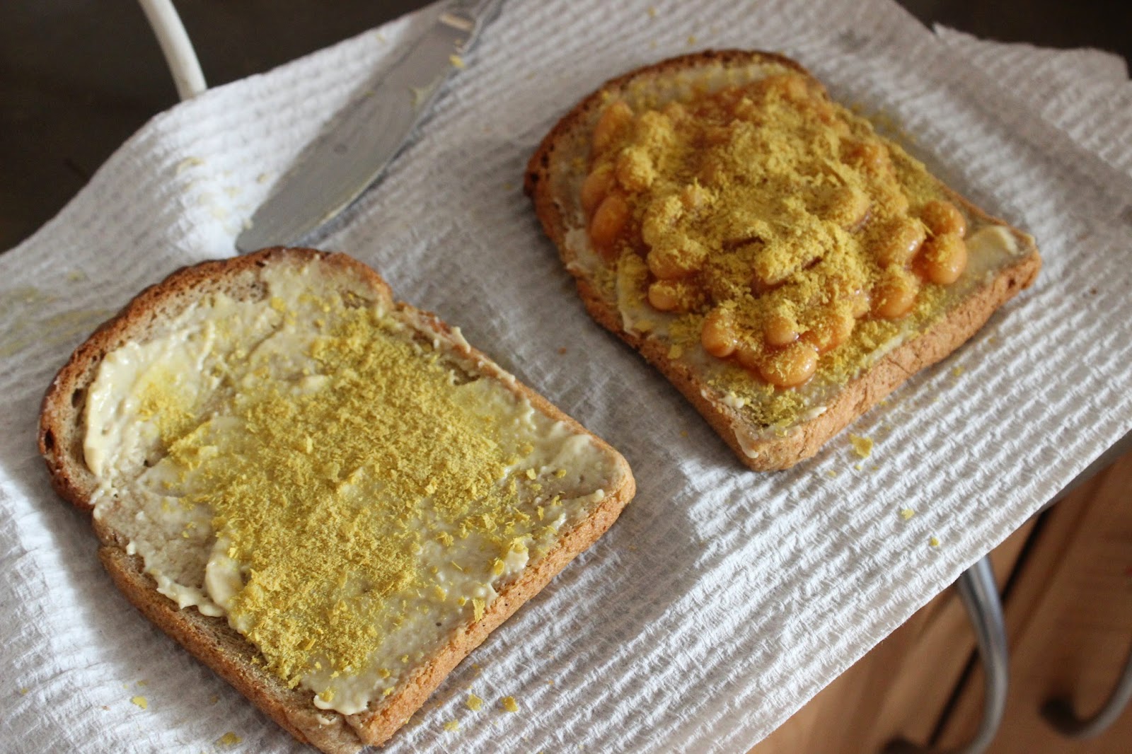 Spread some 100% rye bread with a generous amount of hommus, sprinkle on some nutritional yeast, top with some baked beans, more nutritional yeast and then place in a jaffle iron/ toasted sandwich machine!