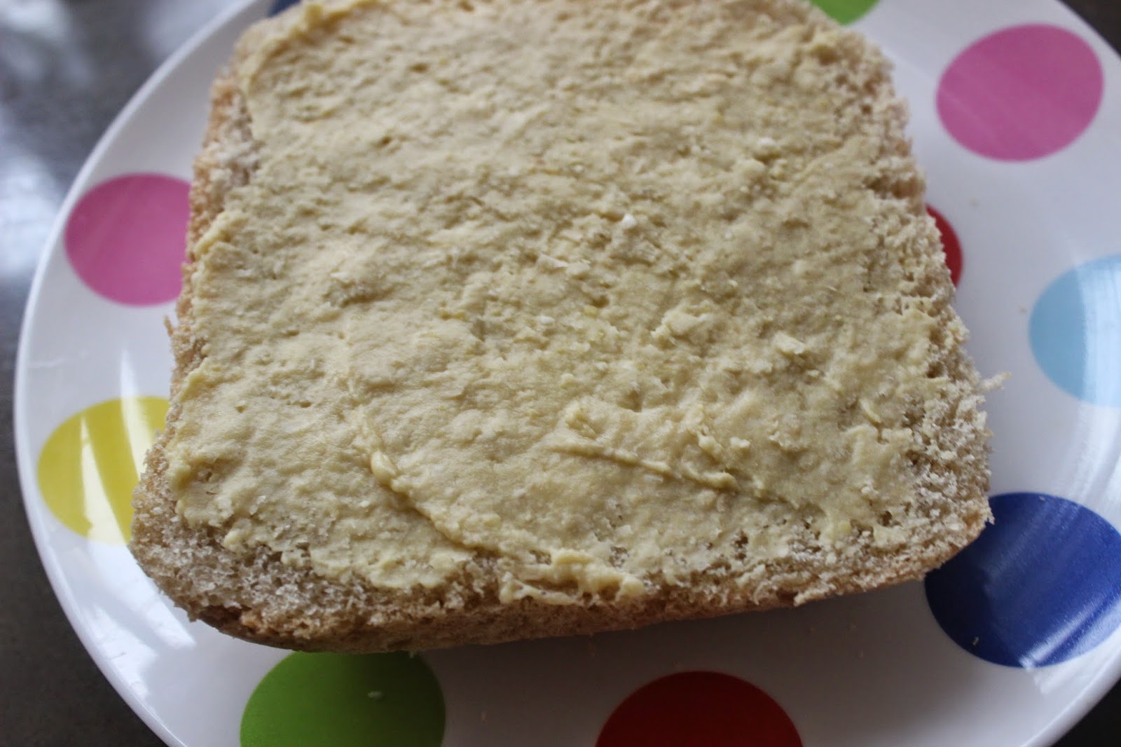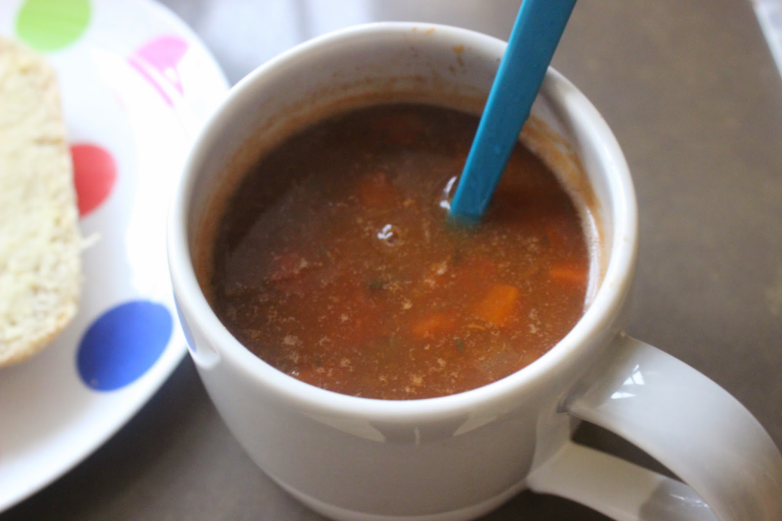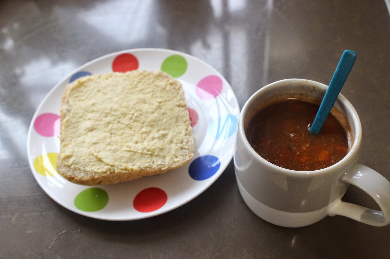 For example this lunch of some vegetables soup with the crust of my homemade spelt bread, warmed in the microwave with some hommus: