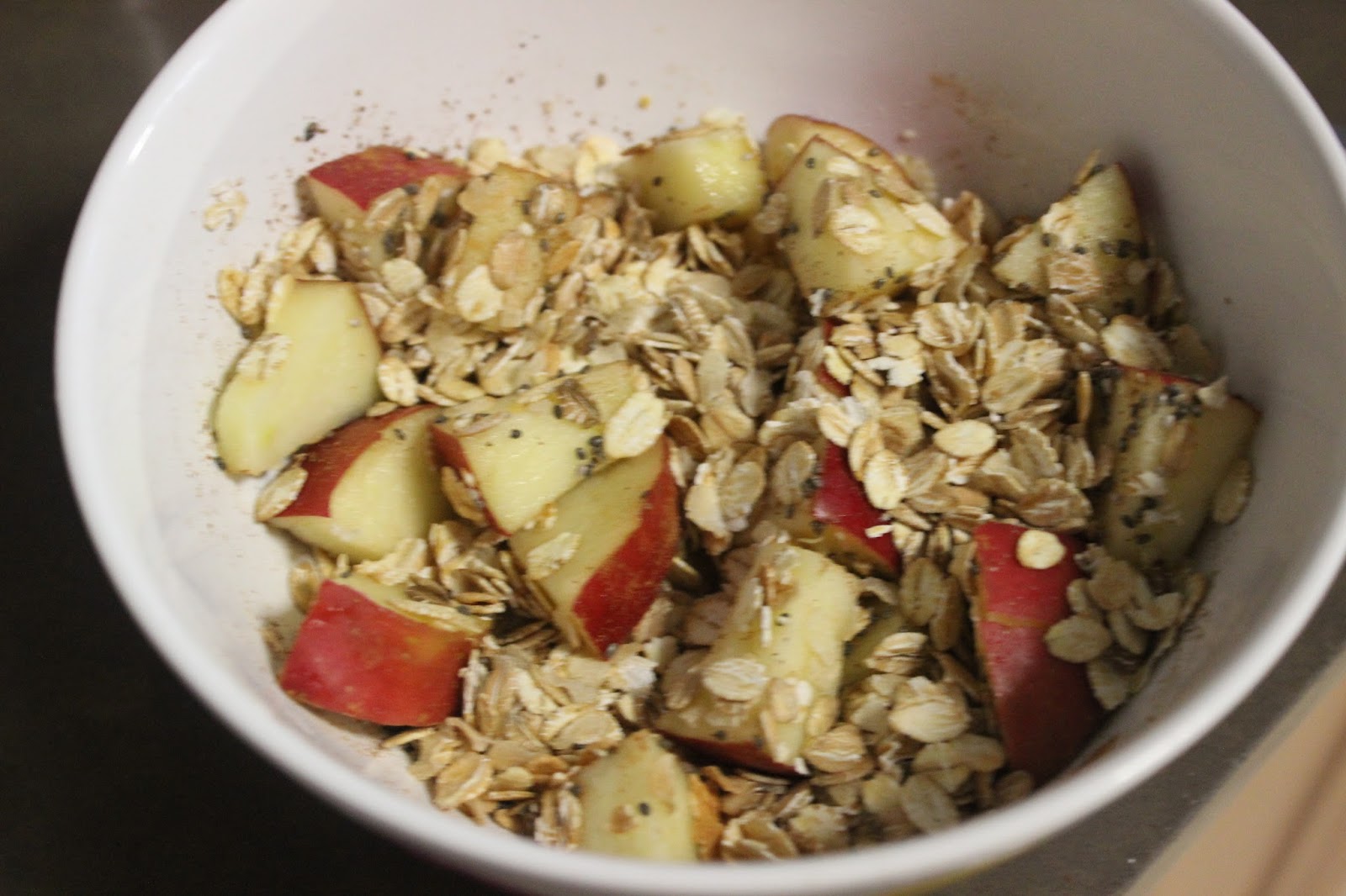 Step 5. Add 2 handfuls of rolled oats, a teaspoon of chia seeds, 1/2 teaspoon (or more) ground cinnamon and the apple to a bowl. Stir to combine: