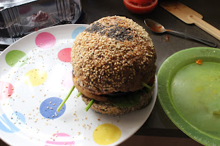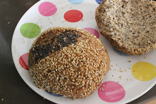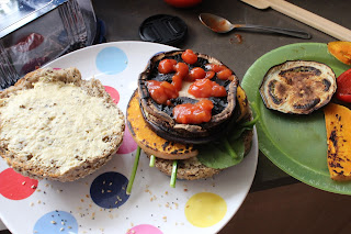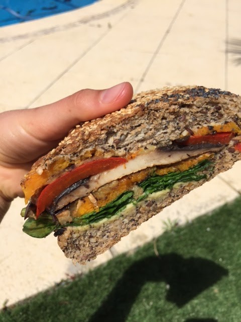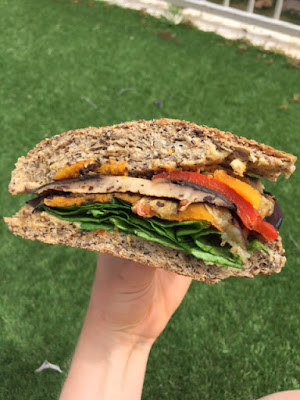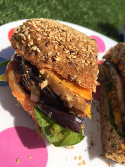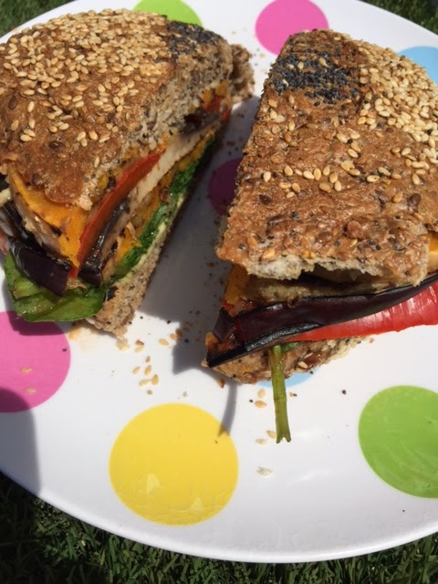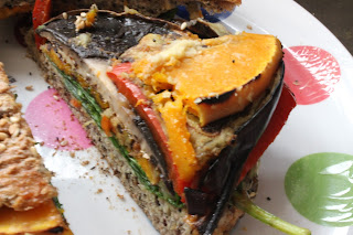 Then also grill up some capsicum and half-cooked pumpkin slices (I microwave mine for a few minutes) and pile it on top of that beautiful seedy wholegrain cape seed roll...