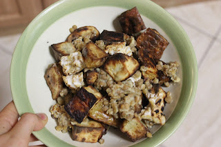 Dinner couldn't come soon enough and quite frankly couldn't ever seem to be enough! I roasted up some white sweet potato (yes, it's back!!!) and regular potato in olive oil for about an hour, then mixed that with some hommus-y lentils and grilled tempeh: