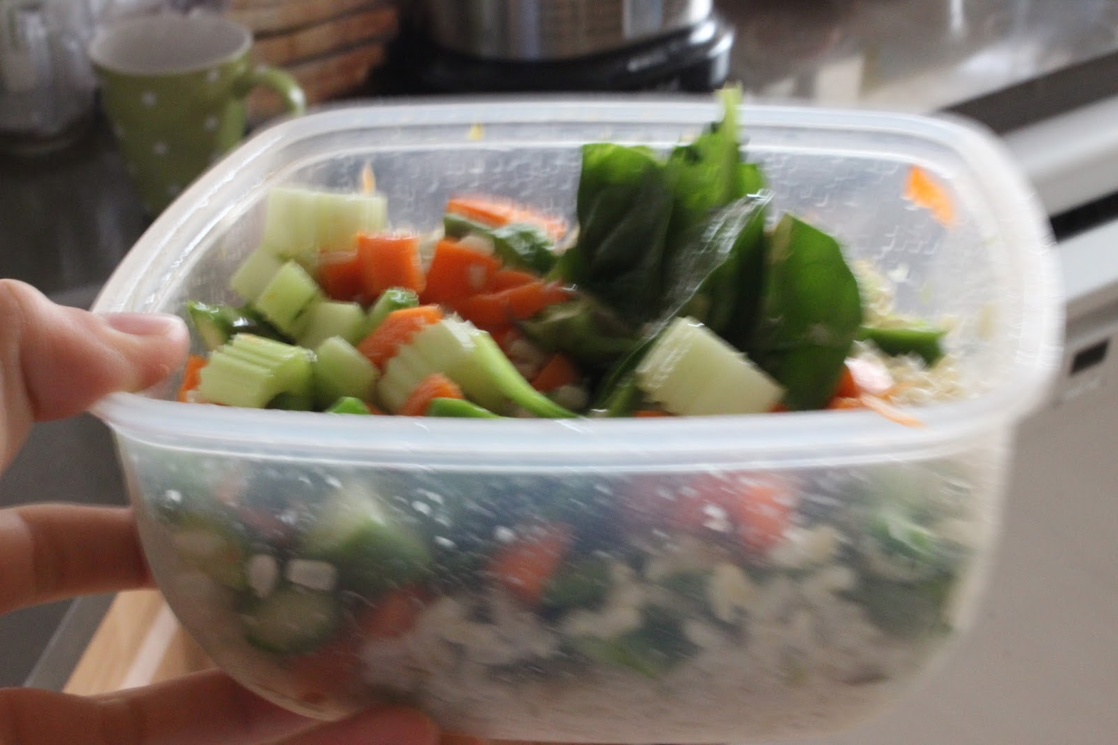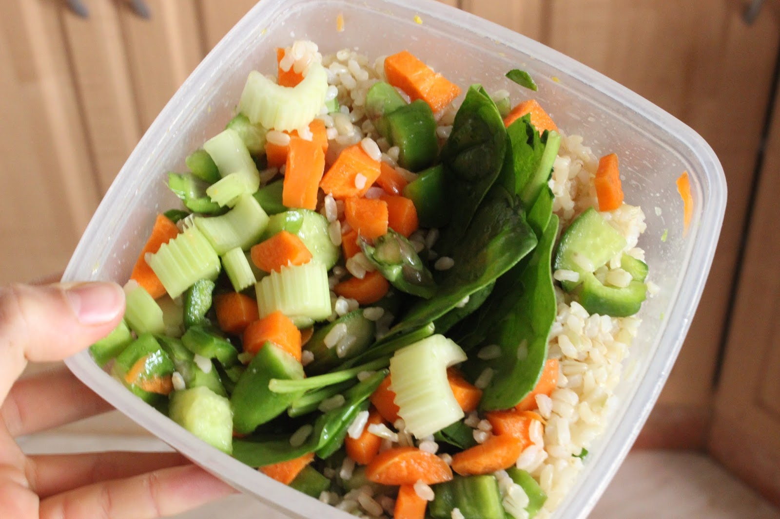 My stomach was having one of those days when it just needed a bit of a detox from life. So I made a simple salad of plain boiled brown rice, spinach, carrot, green capsicum, celery, raw asparagus and... that's it!