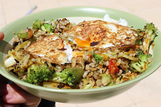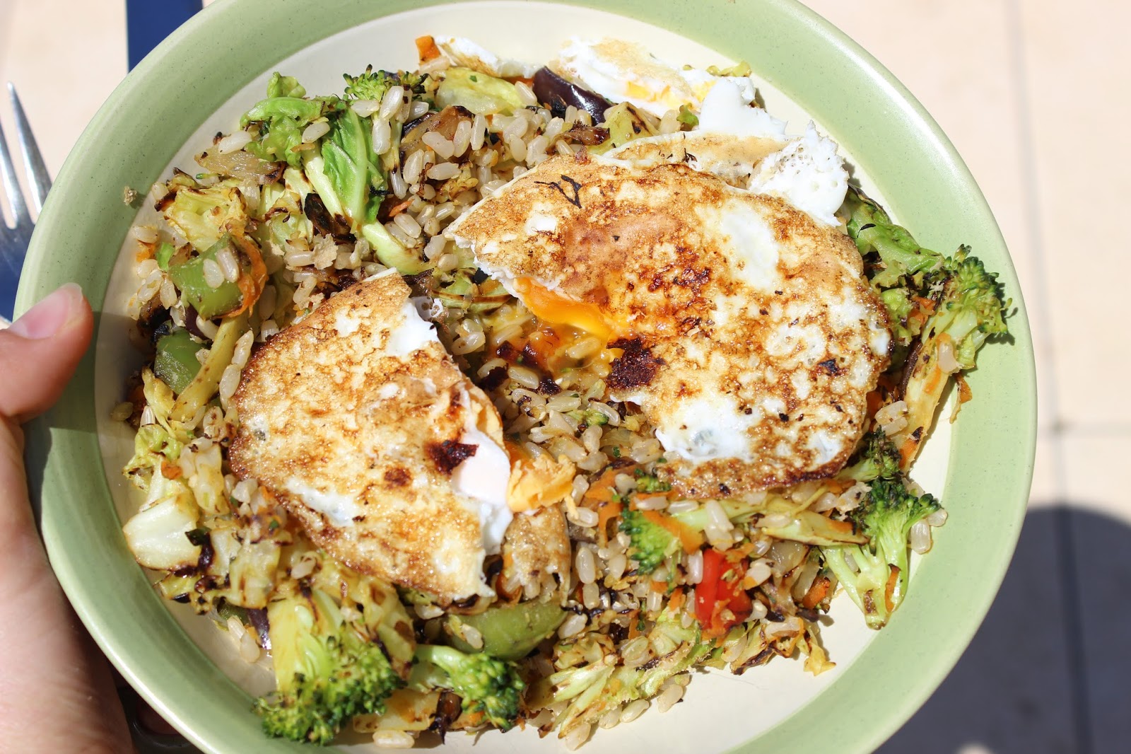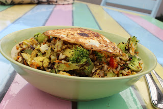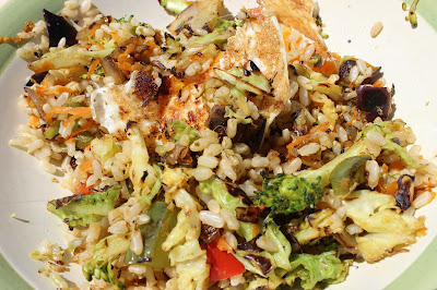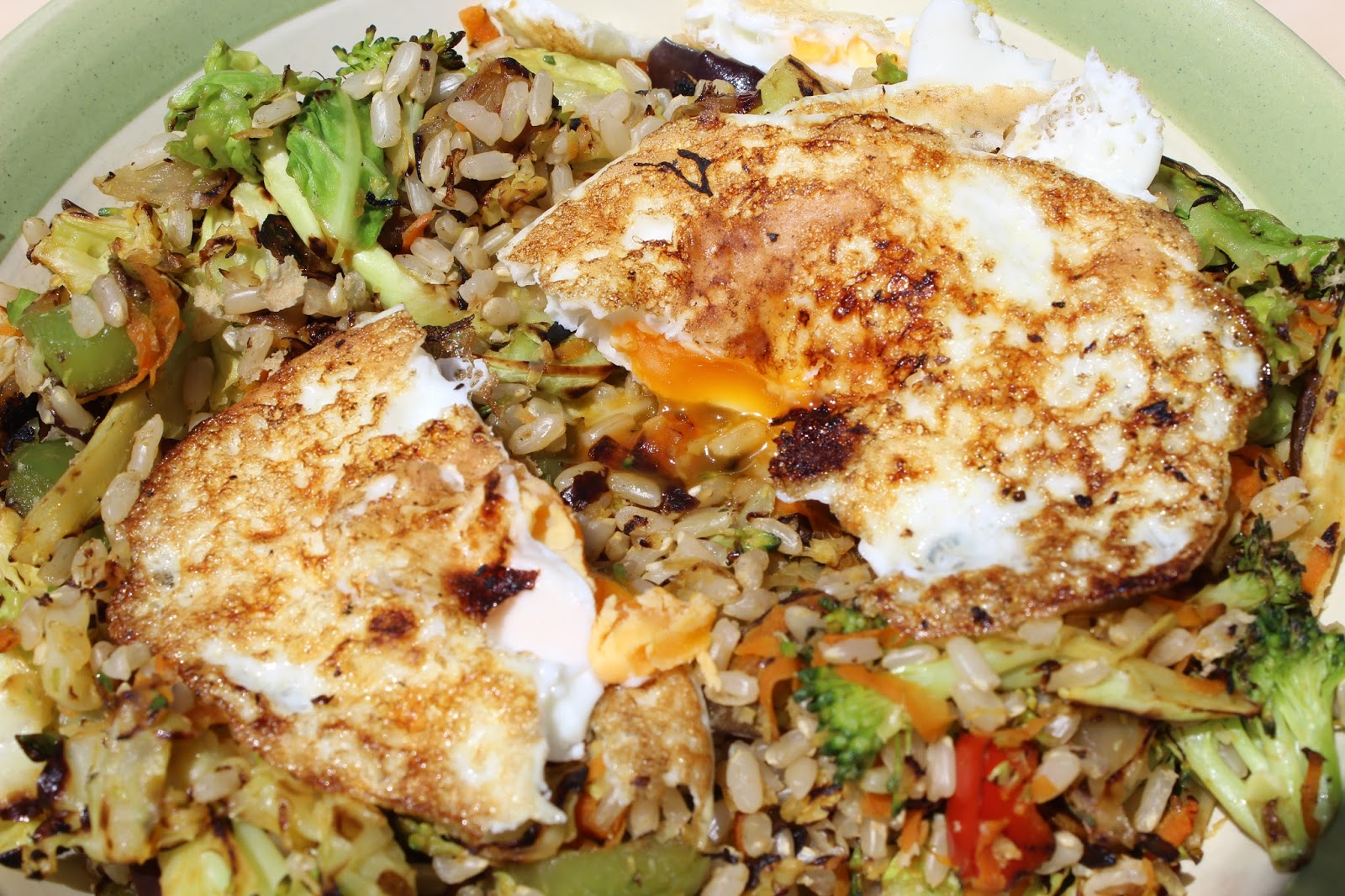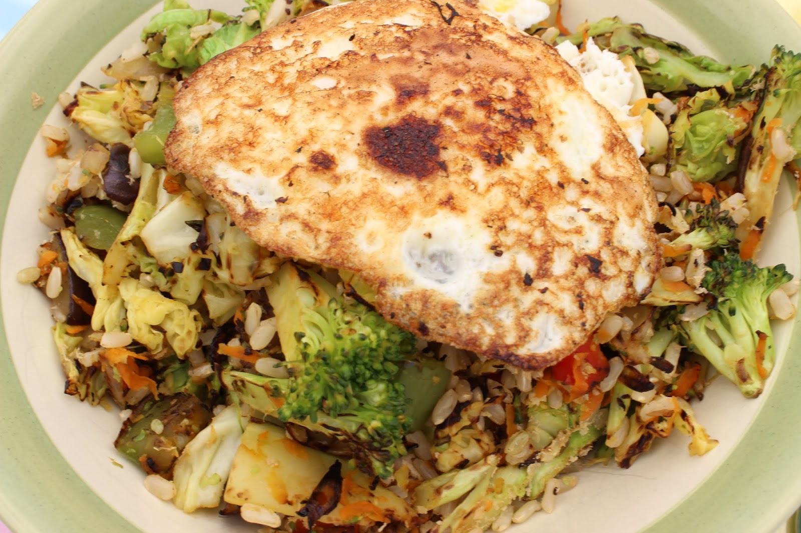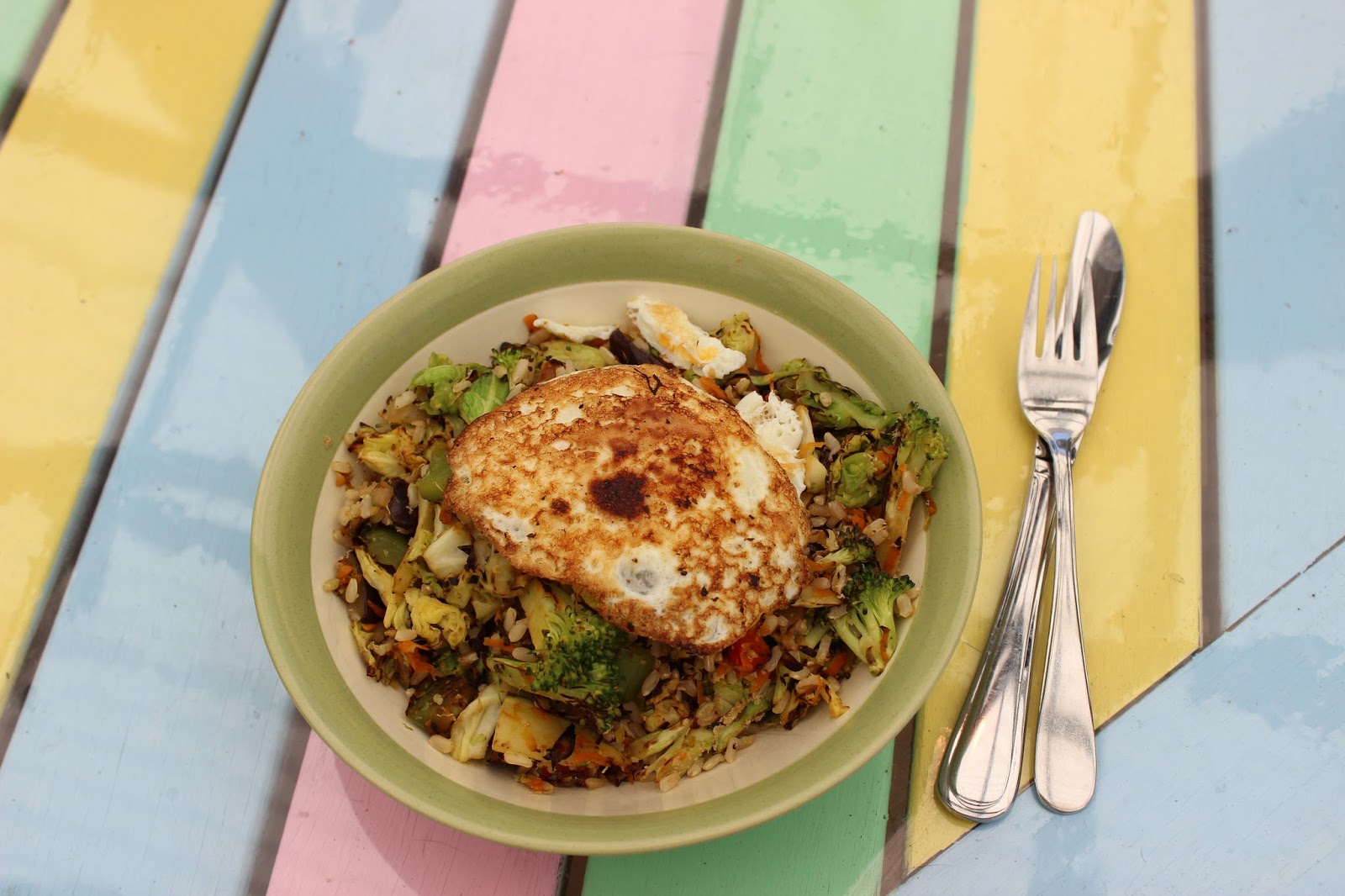 I simply cooked up the brown rice until tender, sauteed the veg in a large fry-pan over medium heat with a little olive oil, onion and garlic, added the rice and kale to the mix for the last few mins, fried up an egg in a touch more olive oil and voila!