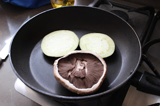 When you cook a large portobello mushroom and two slices of eggplant in a non-stick fry-pan until tender and brown...