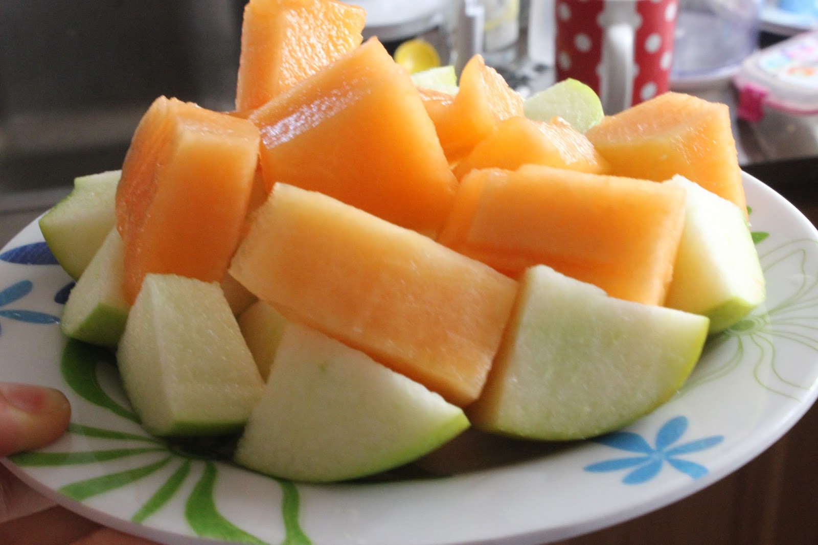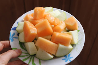A granny smith apple with the most beautifully ripe, sweet and perfect rockmelon/ cantaloupe I think I've ever had!