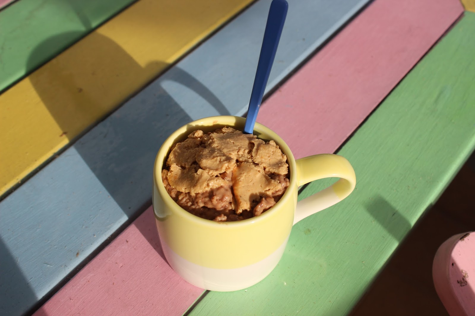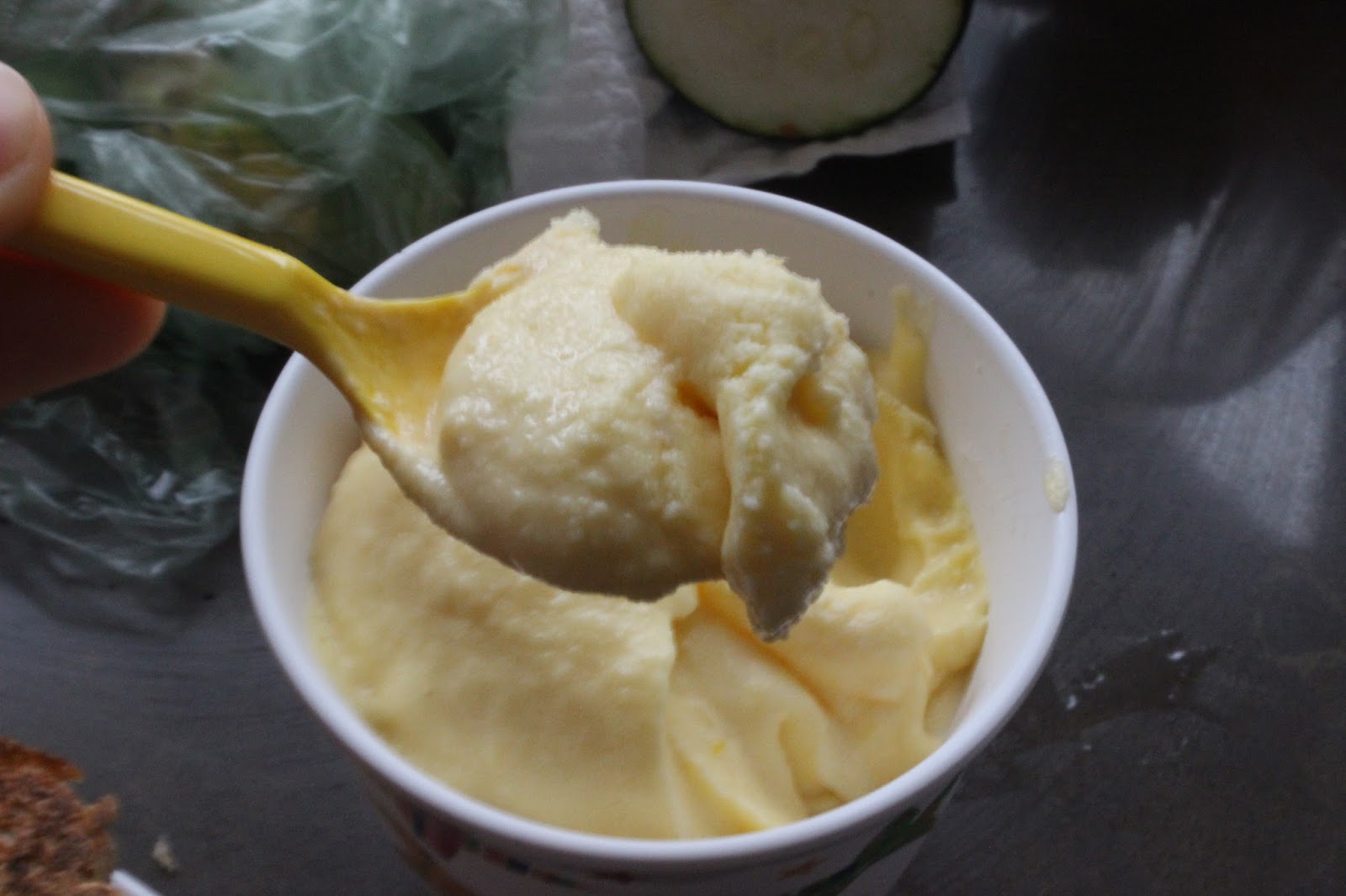 Mango fro-yo (frozen mango + greek yoghurt blitzed in a food processor until smooth)Plus a cashew butter and banana toasted sandwich on home-made spelt/ rye bread: