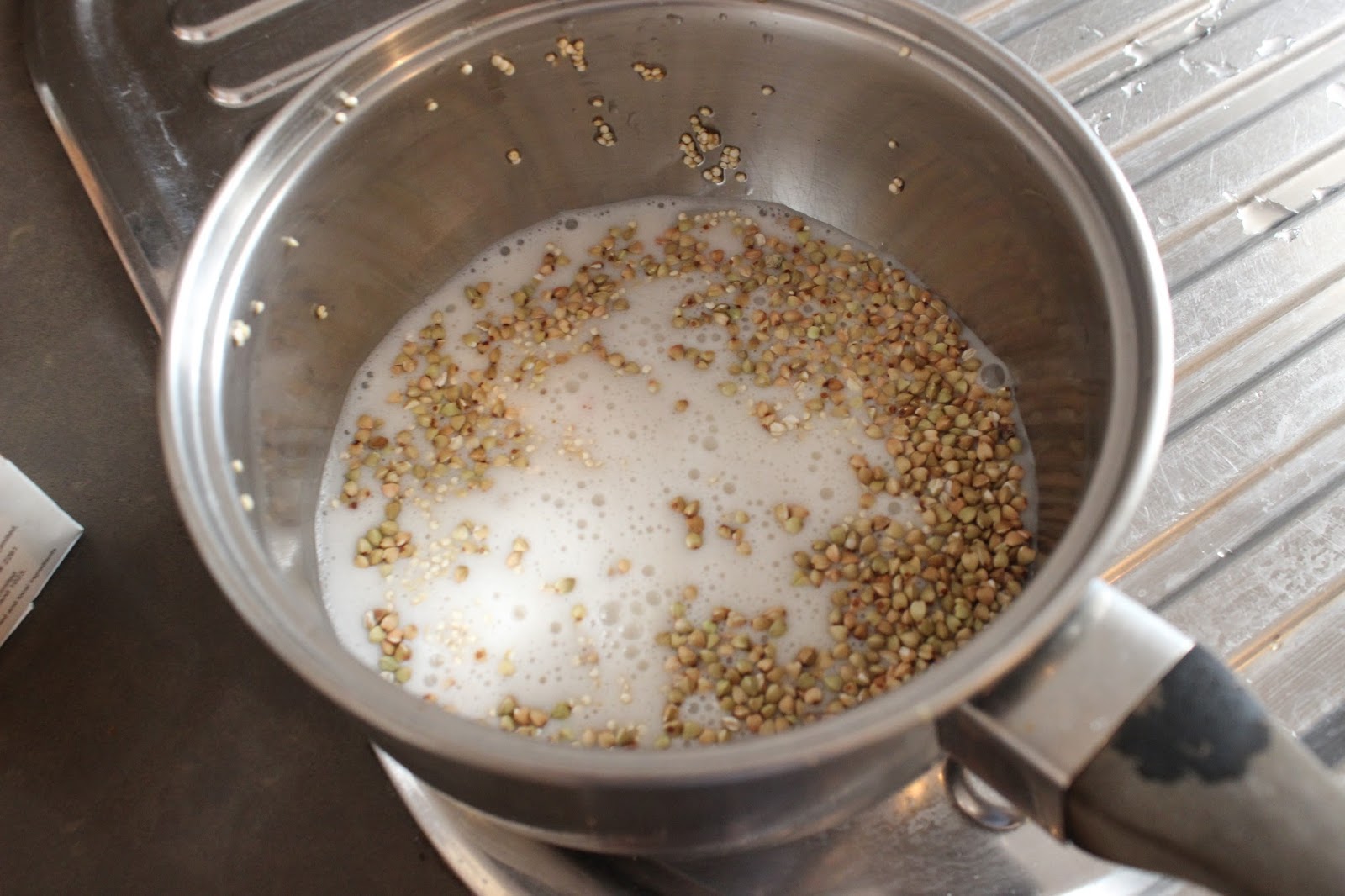 2. Rinse quinoa and place in saucepan with buckwheat, cinnamon and almond milk in a small saucepan over medium heat, stirring occasionally until absorbed (add some extra water if liquid absorbs and quinoa and buckwheat are still crunchy!)