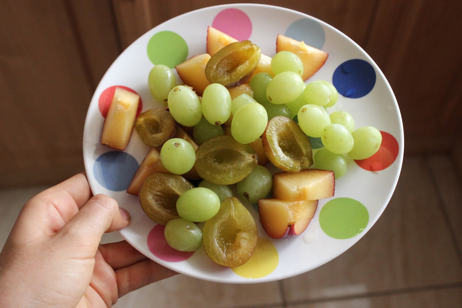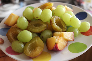 Some delicious fresh fruit; cut up plum, some sugar plums and some green grapes- so delicious!