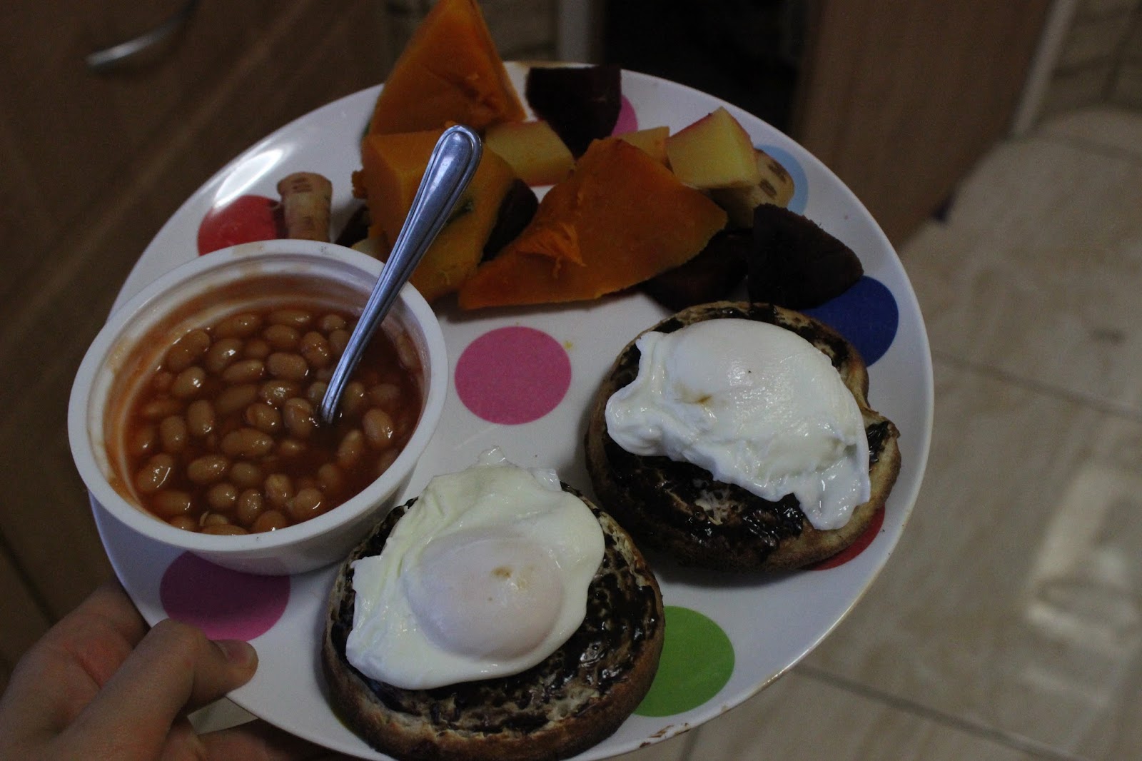 Steamed veg (pumpkin, beetroot, parsnip and swede) with some reduced-salt baked beans, with some wholemeal crumpets spread with Vegemite and topped with poached eggs. Easy to cook up and even easier to eat!