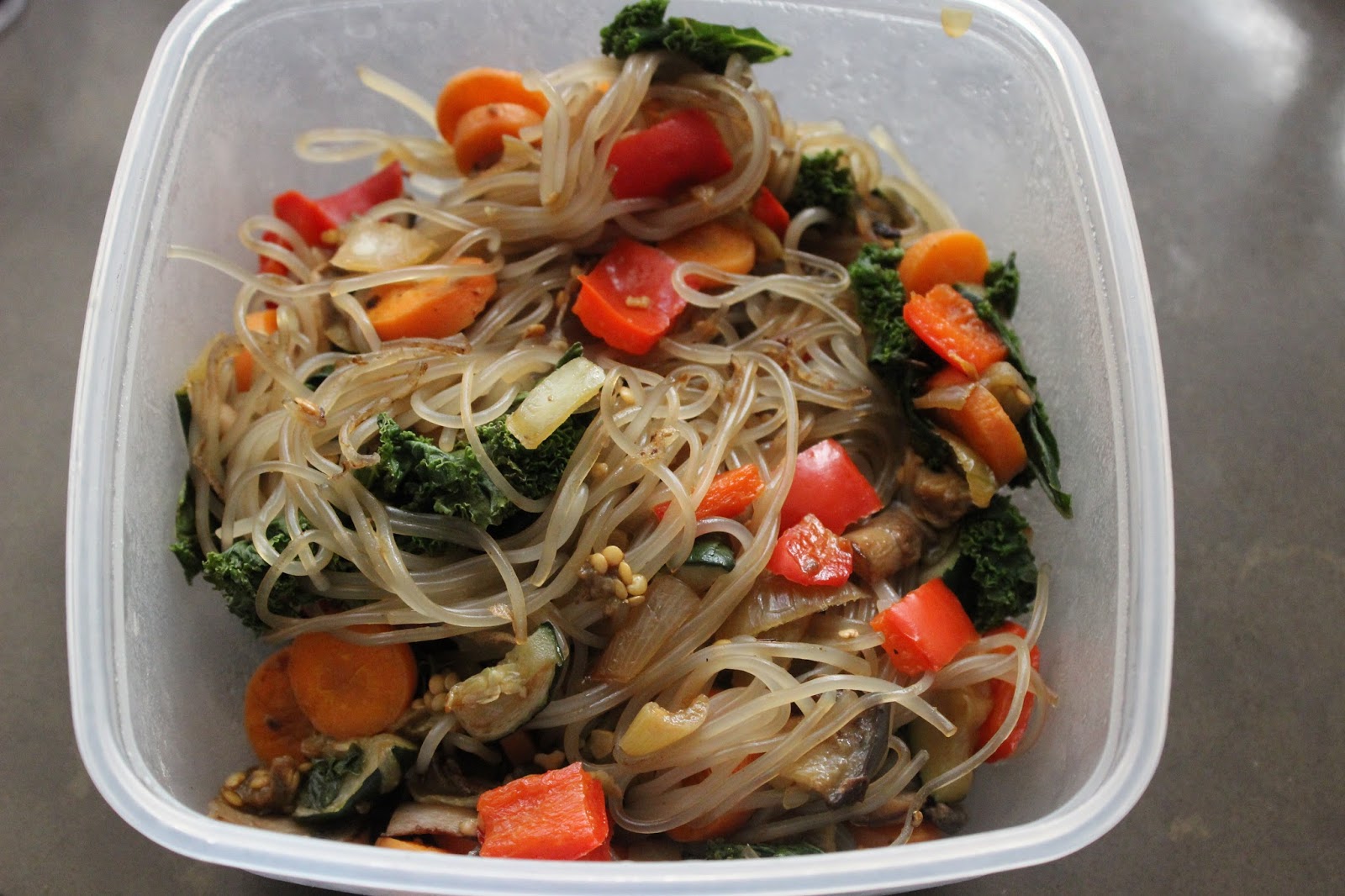Enter this delicious stir-fry creation- heated some sesame oil in a pan, sauteed some veg (garlic, onion, carrots, capsicum, eggplant, mushrooms and kale) all mixed together with some cooked sweet potato noodles added to the pan at the last minute! Happy days!