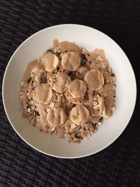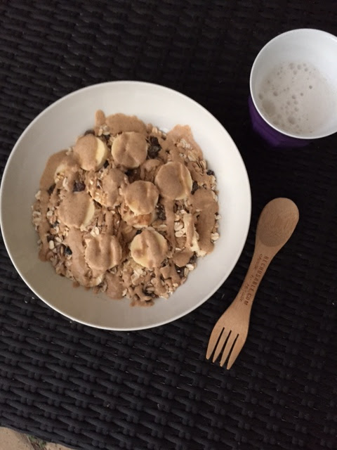 The sauce was simply around 1 tablespoon PB2, 1/2 teaspoon mama powder and 1/2 teaspoon cinnamon with some almond milk. definitely add some agave/ maple syrup if you're after a sweeter sauce, but I preferred the savoury note it added to the sweet muesli and banana.
